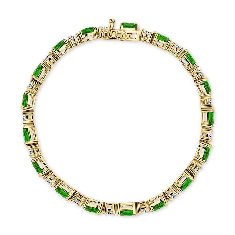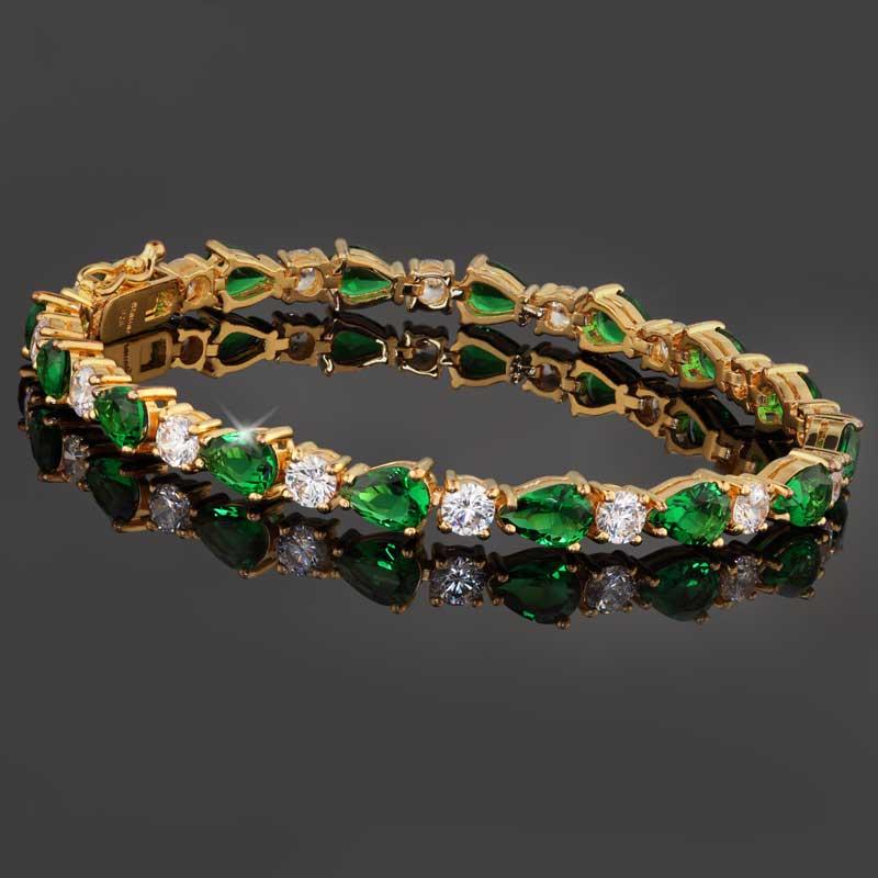 Helenite is indeed a piece of American history, and now she can wear this storyteller as a beautiful bracelet. We found the cream of the crop of helenite and had it cut and faceted by skilled craftsmen into a perfect teardrops. Enhancing this stunning miracle of nature even more are rounds of the Ultimate Diamond Alternative®, DiamondAura®. Set in 14K gold-finished silver, this is a bracelet that promises to make a romantic impact of historical proportions.