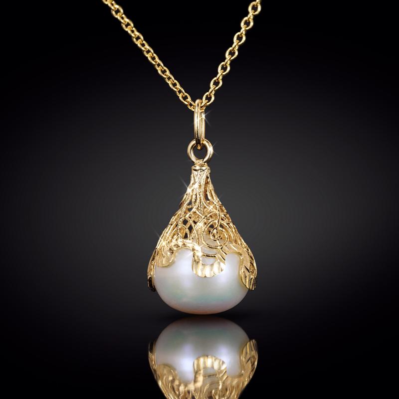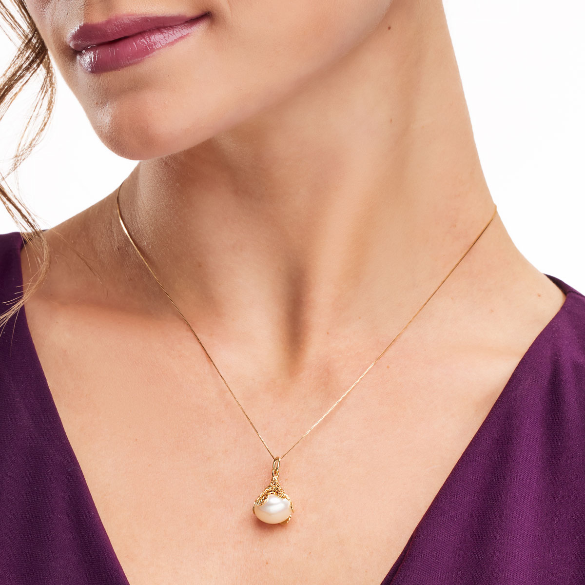 This necklace captures the enchanting beauty of a full moon coaxing first kisses and whispered promises from those caught in her glow. A luminous 12 mm cultured freshwater pearl is set in 14K Italian gold filigree metalwork that is meticulously made by hand for each piece.