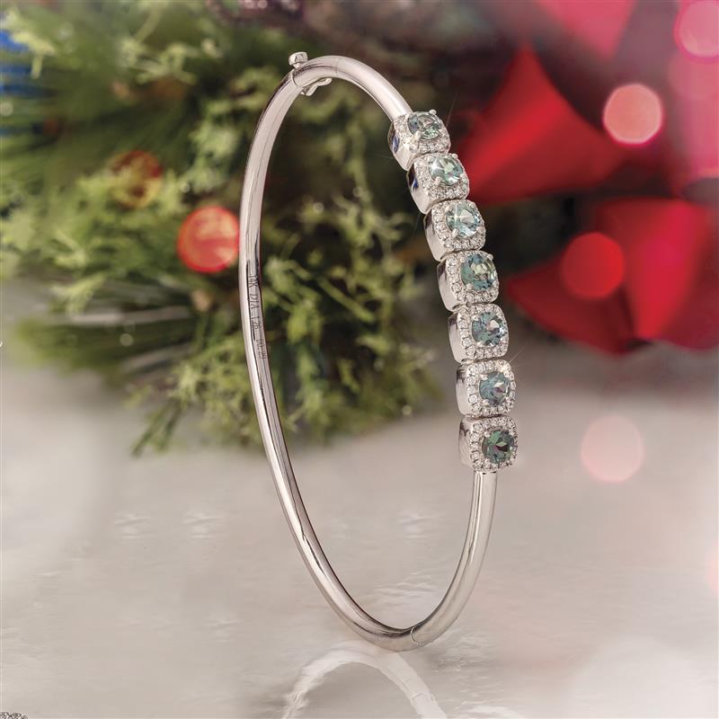 We were intrigued and so we sought out and secured an exceptional collection of alexandrite gems. We then had them prong set and surrounded them with the sparkle of white diamonds for an awe-evoking show.