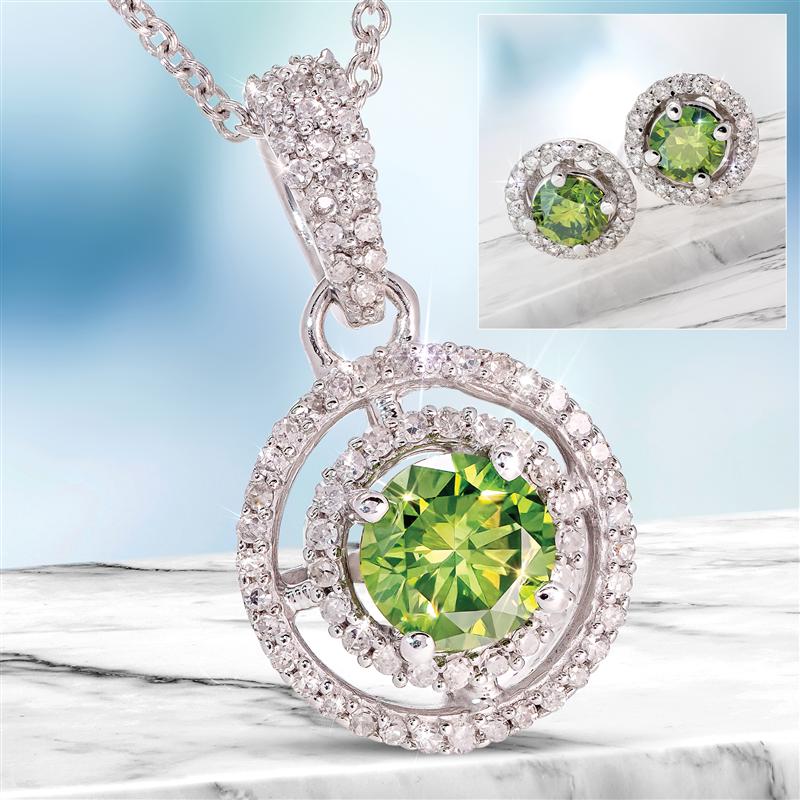 We’ve procured a cache of green diamonds for our connoisseurs of rare and splendid gems. These pieces celebrate one of nature’s most elusive gemstones with rounds of natural-mined gemologically heated diamonds in a gorgeous shade of peridot-meets-emerald green. To punctuate the beauty, we surrounded the green diamonds with traditional white diamonds and then mounted them in exquisite halo settings of 14K white gold.
