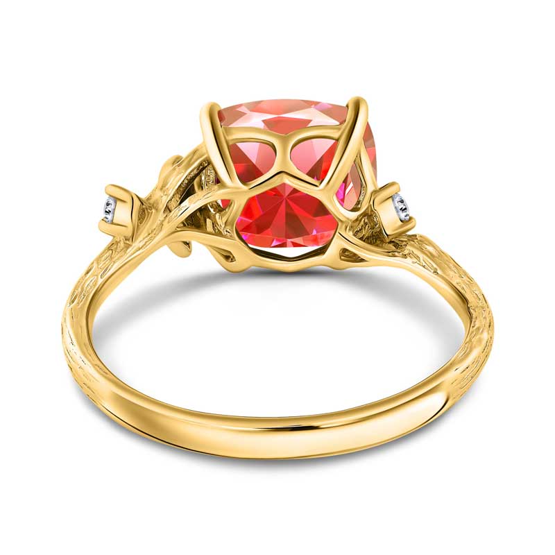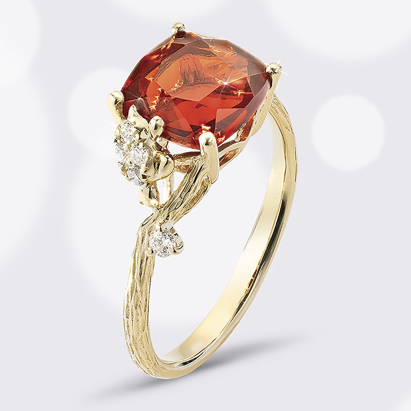 Fire opals are truly spectacular, sparkling with an inner fire saturated with every hue of red and orange on the spectrum. As its name suggests, this gem sprang from fire–– in particular from the ancient volcanoes of the Jalisco region of Mexico. Nicknamed the “hummingbird stone” by the Aztecs for its resemblance to the bird’s colorful plumage, here fire opal shines with a sprinkling of white diamonds and a gleaming 14k yellow gold setting.