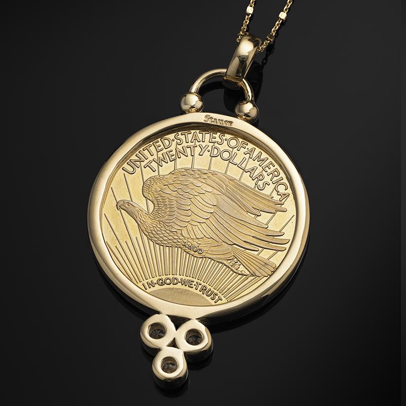 The headline says it all: “The World’s Most Valuable Coin Sells at Auction for $18.9 Million.” That coin was the 1933 Double Eagle, a $20 gold coin that shouldn’t exist. In 1933, as part of his effort to bolster the economy during the Great Depression by getting America off of the gold standard, President Franklin Delano Roosevelt ordered the melting down of all 445,500 of the 1933 Double Eagles, which had been struck but never issued. A handful of these rare coins escaped; only one is known to exist in private ownership today, making it one of the world’s rarest coins. That incredible story is what inspired this pendant. Forged with a yellow gold finish, our Double Eagle Pendant features a replica of the world’s most valuable coin. Crafted with a vintage look and three rounds of DiamondAura®, the Ultimate Diamond Alternative®, this pendant is sure to turn heads every time it’s worn.