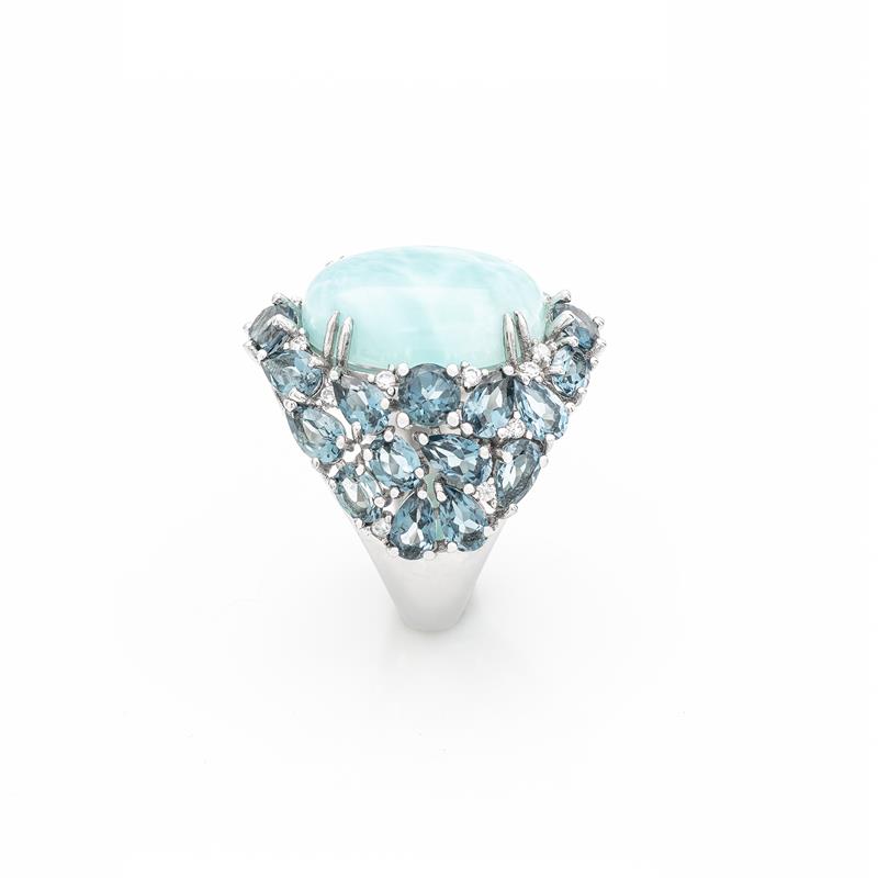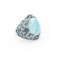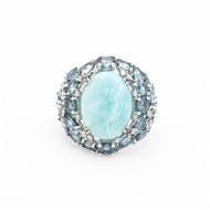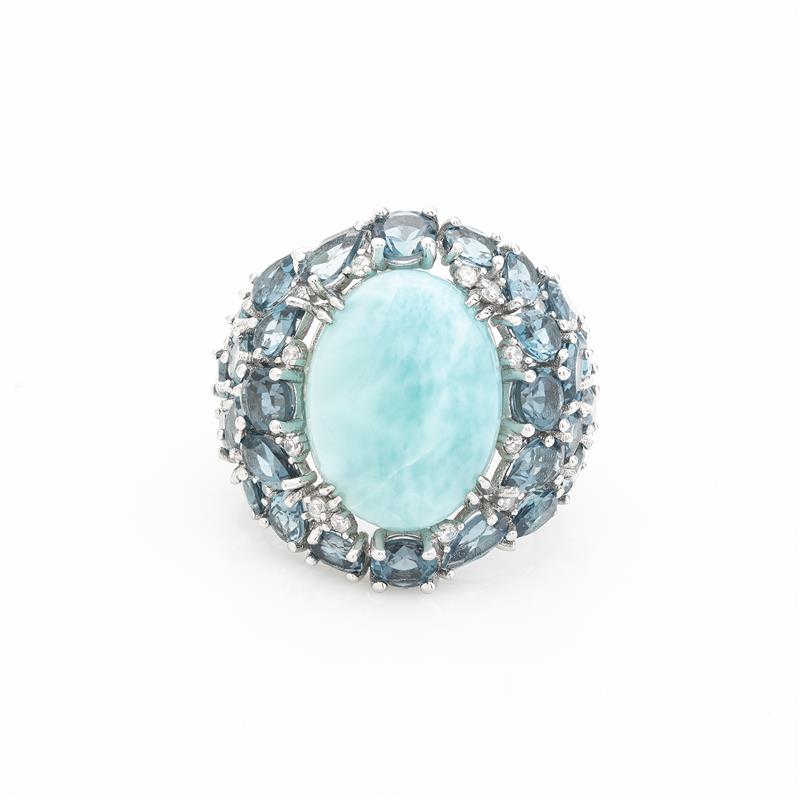 The oval-cut Atlantis Larimar & Blue Topaz Ring proudly showcases an oval-cut ocean blue Larimar stone. This sizeable and unique artifact hewn from that exclusive mountain is surrounded by the desirably deep hue of 28 London blue topaz stones in oval, round, and pear cuts. We're offering Larimar at a price that will shake up the jewelry industry, and anyone who dares charge you more deserves to sink without a trace.