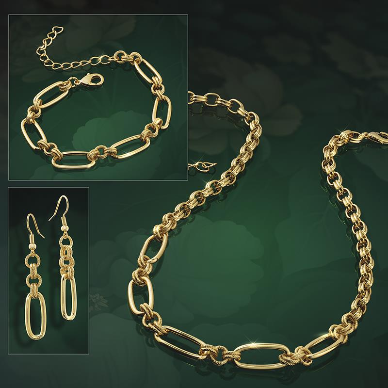 Everywhere you look, bold chain-link jewelry is in the limelight, from the runways of top fashion designers to the Instagram pages of young influencers, to paparazzi photos of celebrities going about their day. And the chunkier the better! Nothing has the power to dress up simple daytime attire without looking out-of-place like a bold gold chain, making these pieces a woman’s best friend for work, play or running errands. Our Chain Reaction Collection is case in point: this necklace, bracelet and earring set allows you to mix and match or don all three for maximum impact. Showcasing two different link styles in a lustrous gold finish, they’re an easy way to get into the chain game and look like you’ve been there all along. So you can enjoy the look of the moment while honoring a timeless innovation in jewelry design — all at a price that can’t be beat.