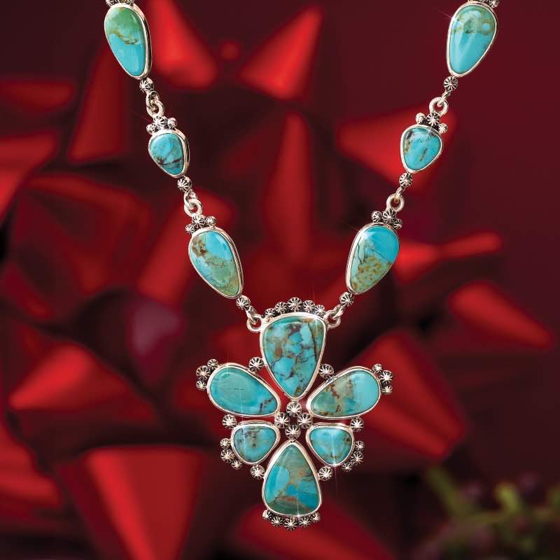 The set's design is both bold and graceful, balancing the earthy essence of raw turquoise with an elegant, polished silver finish. Its unique pattern makes every piece one of a kind, a wearable work of art that instantly elevates any look. We dare say it’s the most beautiful turquoise necklace we’ve ever seen so when our designer dreamed this up, we knew instantly that we had to show it to you. It’s a celebration of natural splendor and fine craftsmanship that captures the essence of Arizona’s rugged beauty.