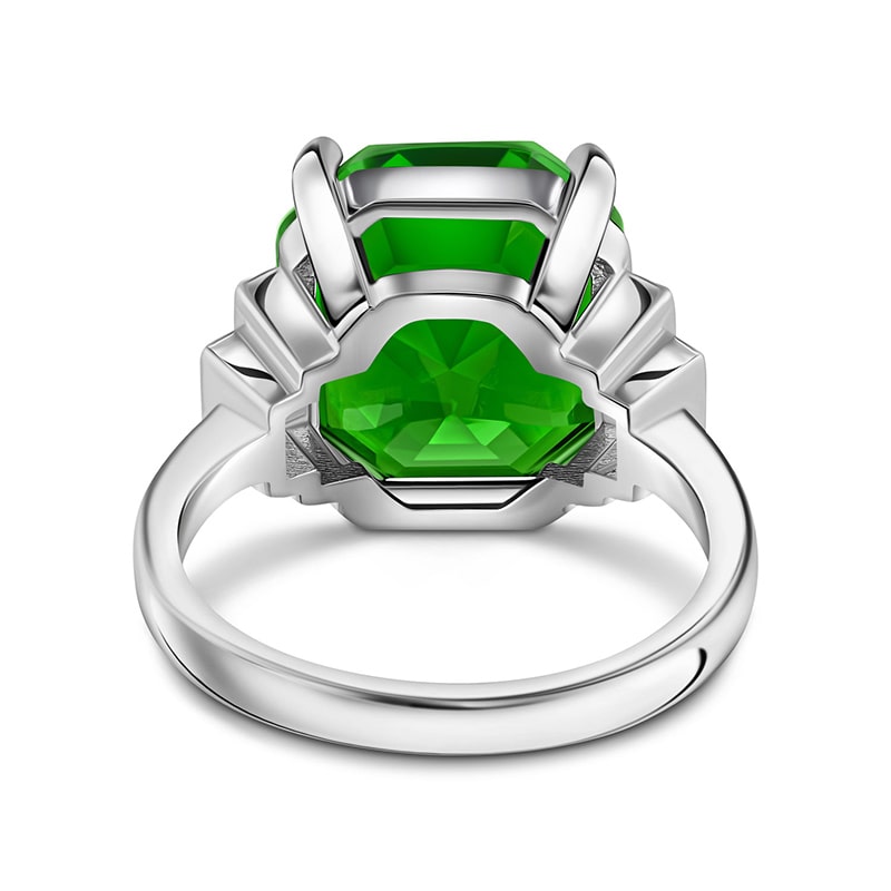 The Elevation Ring features a generous 7.50 carat stone of this American treasure, in a unique octagon cut that gives you an incredible view of eight sides of this mesmerizing green stone. The incredible strength and fortitude of helenite is amplified by the fire of 14 diamonds.