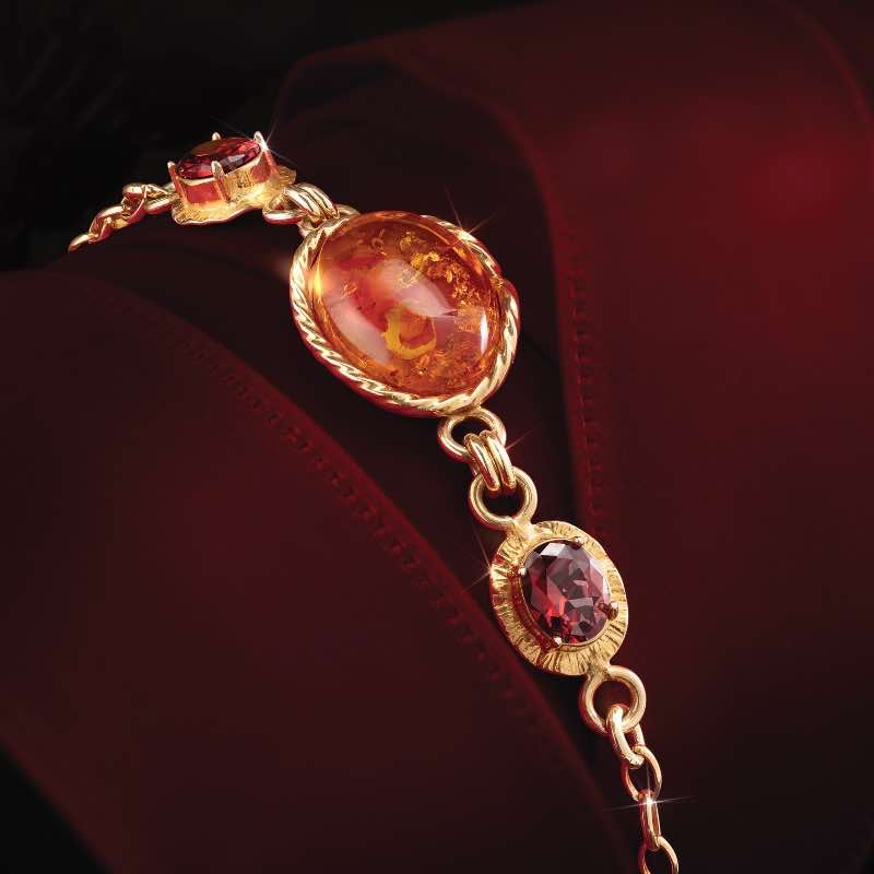 In scientific terms, amber is the fossilized resin of ancient trees. The world’s oldest natural “gem,” amber was among the first substances to be prized for its precious beauty. Here, the rich, jewel-toned hues of garnet contrast beautifully with amber’s warm, translucent glow, set in gold-finished sterling silver. This interplay of colors creates a vibrant visual impact, where the deep, intense garnet accents the luminous, golden amber. A winning combination that celebrates both contrast and harmony.