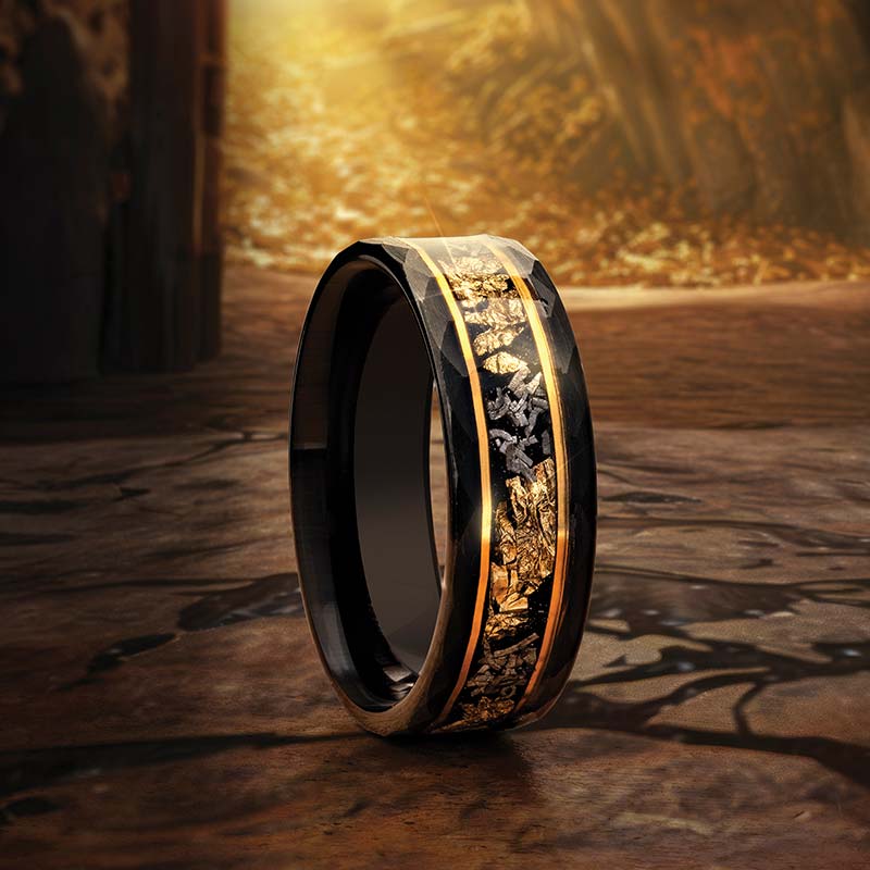 Now picture this: a ring, not just any ring, mind you, but a masterpiece crafted to adorn the fingers of the discerning. Crafted with meticulous care, each piece encasing ribbons of 24 karat gold in a Tungsten setting, whispering tales of luxury and prestige. A symbol of power and sophistication. This isn’t just a ring, it’s a statement. On any adventure, let this ring be your companion, a silent witness to your every triumph. Ahhh… the rush of a gold rush.