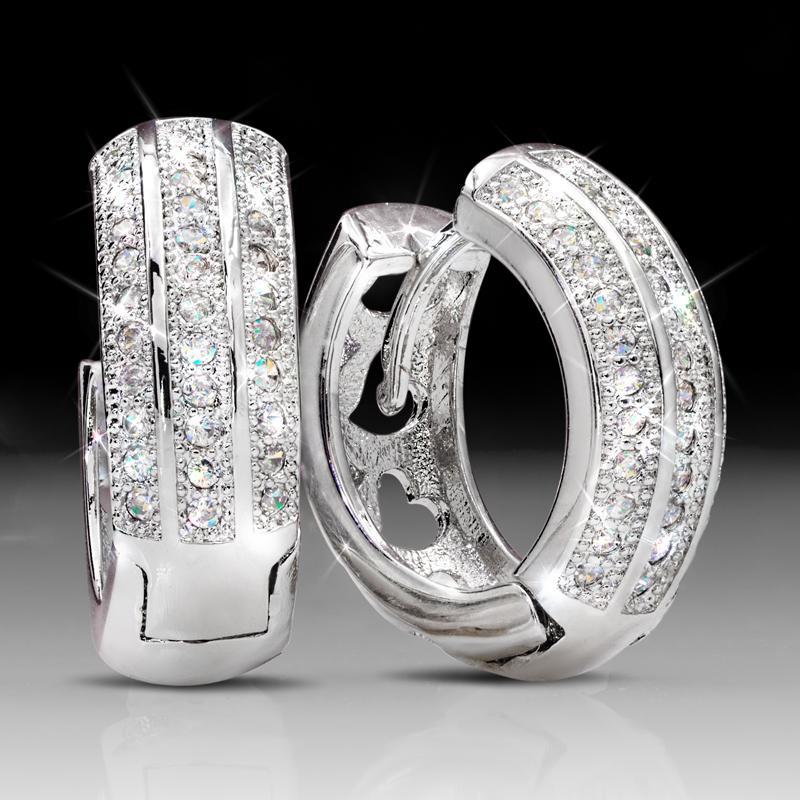 Classic hoops get up close and personal in a design that sits more snugly on the ear— enveloping them in irresistible sparkle. 18K white gold finished hoops are shimmering with the Ultimate Diamond Alternative™, DiamondAura®–– stones that rival mined diamonds in fire and clarity and run circles around them in price.
