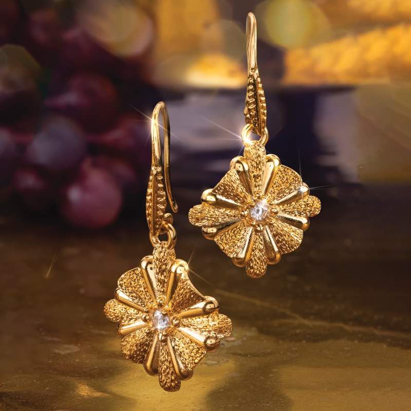 So Stauer went to our designer in Italy to create a Renaissance-style starburst pendant and earrings with a moissanite stone in a setting encased in 18k gold. Italian jewelry with a stone that fell from the stars. Sounds like a good starting place for a fine little romance.
