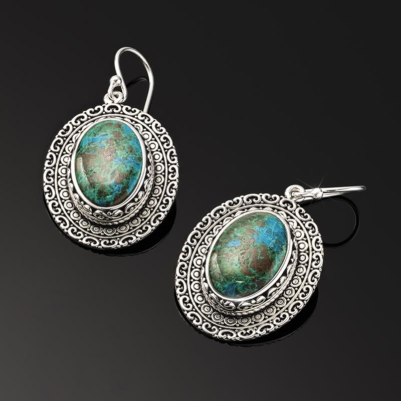 King Solomon was as renowned for his wealth as he was for his wisdom. Over the past 3,000 years, there have been numerous attempts to locate his mines. While the debate over the location of King Solomon’s mines continues to rage, we do know one thing: You can make part of his kingdom yours. Presenting chrysocolla, a colorful gemstone of vivid blue and green brilliance believed to be first discovered in Solomon’s mines. Here, we present nearly 23 total carats of this kingly gemstone in regal settings with an oxidized silver finish. Through our connections around the globe, we’re able to offer this fabulous stone for a price that King Solomon himself would envy.