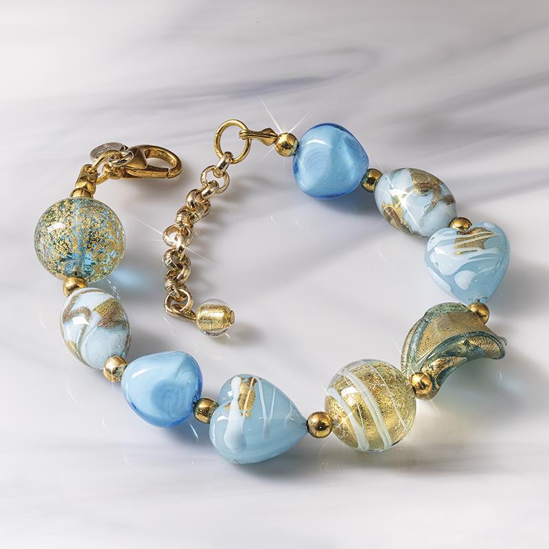 Those techniques are on full display in our Laguna d'Oro Murano Collection, a necklace, bracelet and earring set inspired by the watery lagoon and the shining city that made it famous. Beads of varying shapes and sizes glisten in gold and aqua hues amidst yellow gold-finished settings. Together, they're an eye-catching tribute to Italy's national treasure, and the next best thing to booking a gondola ride at sunset.