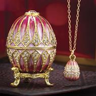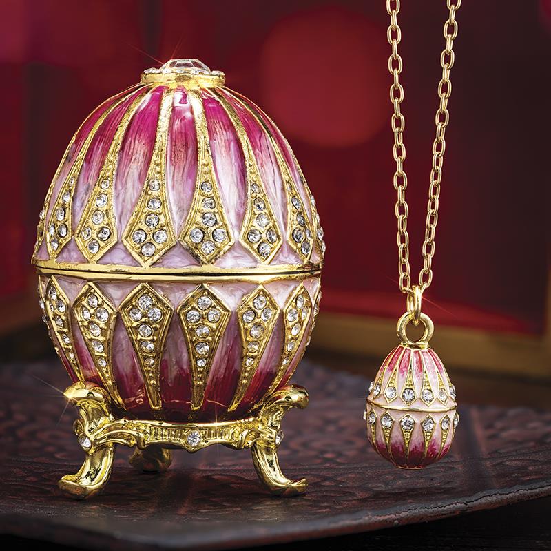 The czar’s jeweler was a genius. As the creator of decorative pieces for Russia’s royalty, the master craftsman and his assistants created dozens of unique Imperial Eggs. No two were the same and each is now worth a fortune. The craftsman invented new jewelry techniques, created bold colors and pushed his elite group of artists to boldly go where even they had not gone before. It’s fitting, then, that we pay tribute to Russia’s legendary royal egg art with some innovation of our own. These decorative enameled eggs evoke the style of the Romanov masterpieces. Regal colors dance among the ornate, hand-painted designs, and each egg rests elegantly on a gold-finished, crystal-studded stand. The hinged eggs flip open for storage or display. Inside, we’ve tucked miniature egg pendants, which dangle from a 22" gold-finished chain.