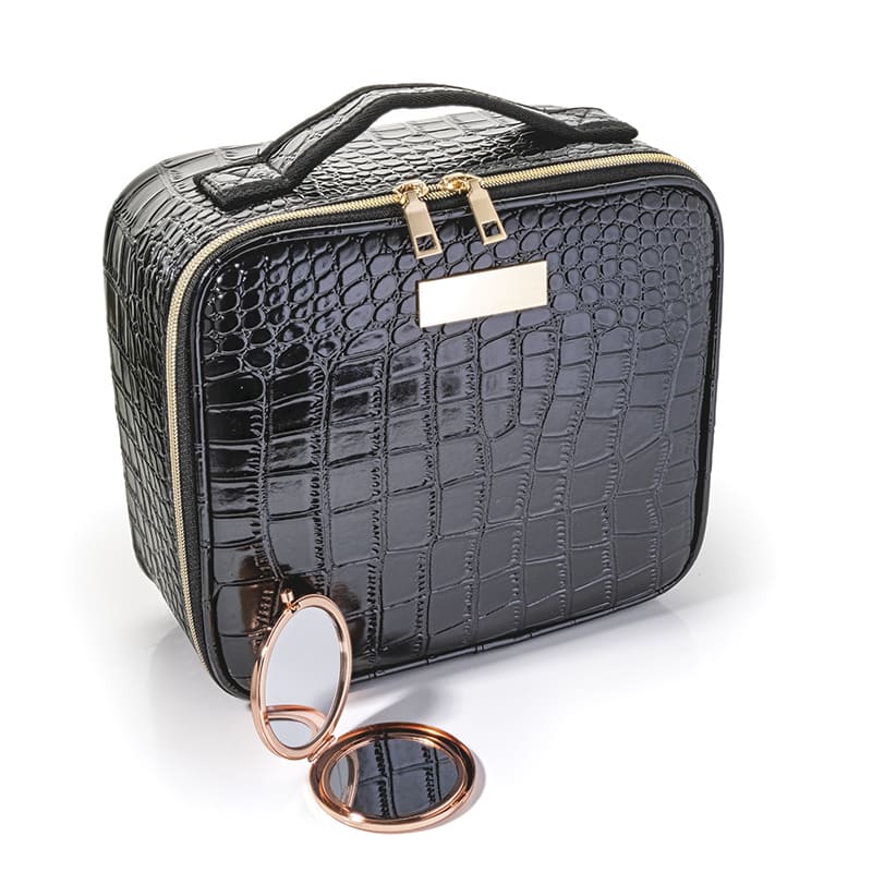Made from crocodile embossed premium sustainable vegan leather, this beauty case is a game changer, sporting seven specially designed large storage compartments and a separate makeup brush bag. A handheld compact case includes a 10x magnifying mirror to help you get in close for any minute touchups.