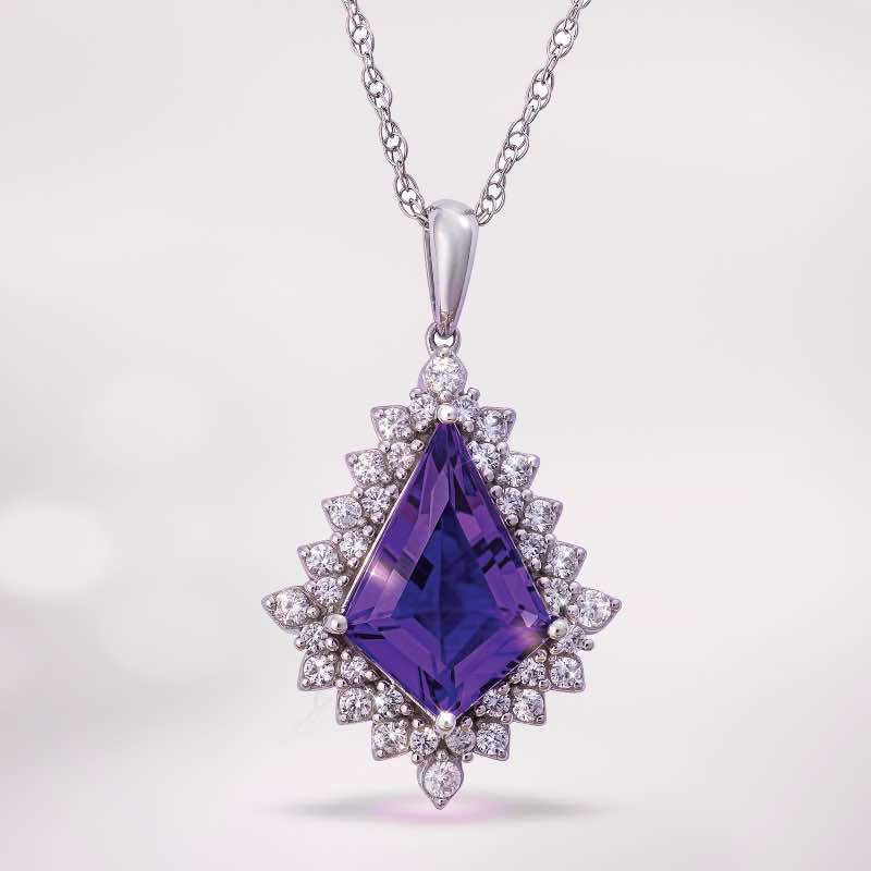 With their deep, velvety purple hues, amethyst from Africa now represents the ideal shade. Even specialists in South American amethyst (a primary source for the gem) concede that Africa currently sets the standard of excellence for this purple beauty. This necklace features showstopping African amethyst in a fancy kite shape — it’s African amethyst’s turn to shine.