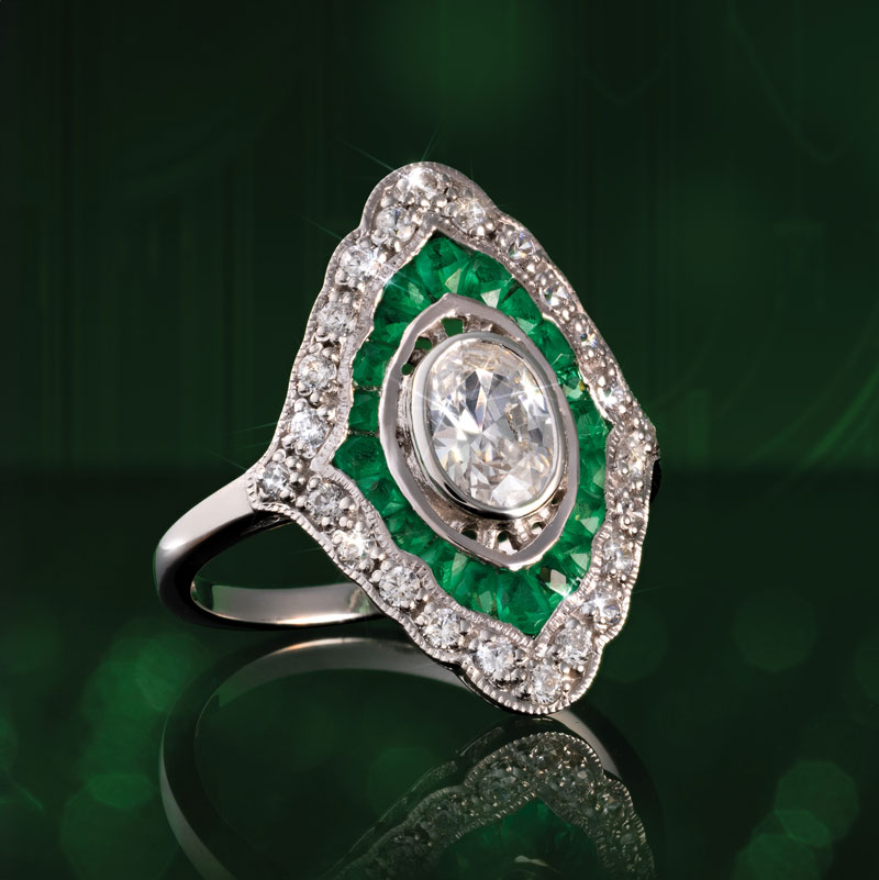 Looking to make an impression of galactic proportions? Then you’ve come to the right place. We’ve joined the most scintillating stone on Earth with one of the world’s most legendary gems and showcased them in one of history’s most influential jewelry styles. Behold the Emerald and Moissanite Art Deco Ring.