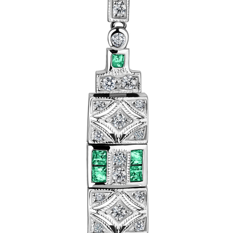 Here, moissanite and emerald shine brightly from the intricate metalwork and geometric patterns that are the hallmark of Art Deco design. One of the most influential eras in the history of design, the Art Deco movement continues to leave its mark on the jewelry world. Both timeless and ahead of its time, this is jewelry for the ages. Set in .925 sterling silver layered in rare and lustrous rhodium.