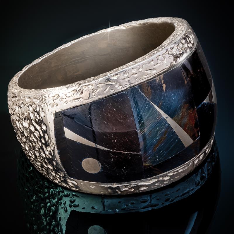 This ring showcases blue tiger’s eye and black jade. Together, these two gems are hypnotic. The signature chatoyancy or cat’s eye effect of tiger’s eye (likened to the sheen off a spool of silk) pairs perfectly with the mysterious dark luster of black jade.