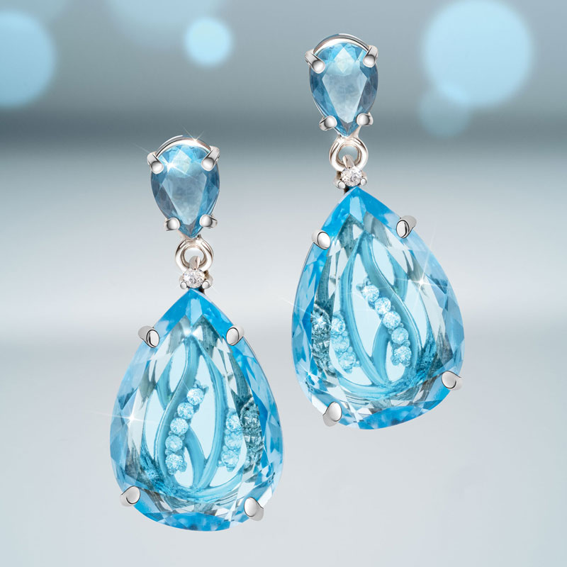 By drawing together light and dark, our Swiss Blue Earrings showcases the vivid, vibrant, electric blue hue and delivers an extra jolt of decadence. The combination of the scintillating blue color and secret accent gems is absolutely electrifying.