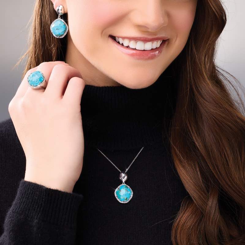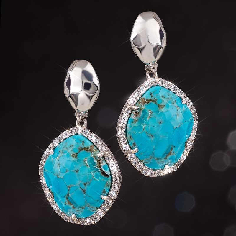 We’ve captured generous cabochons of turquoise featuring an array of green and blue shades with exquisite veining and marbleized patterns. We upped the elegance by pairing the rare blue beauty with sparkling white topaz and a sterling silver setting. Each stone is unique in exhibiting its own unique color and matrix.